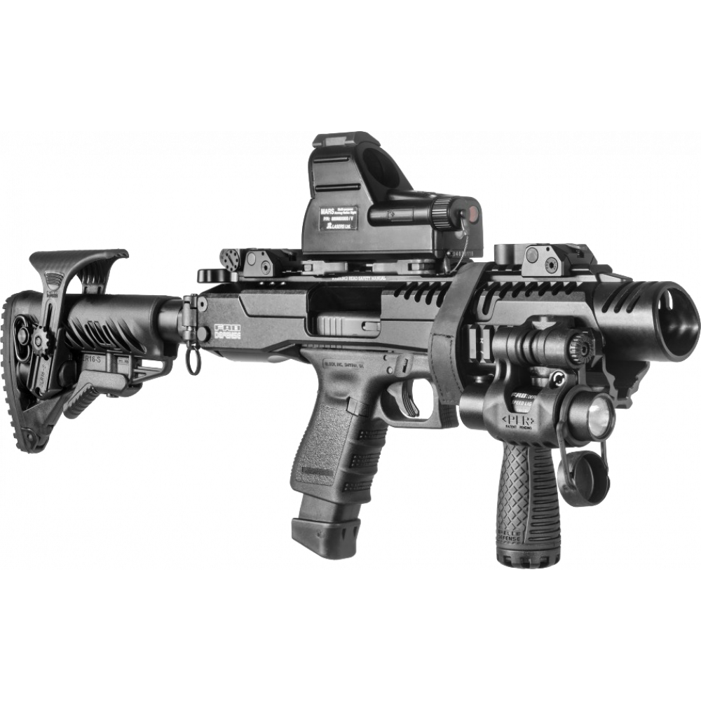 Комплект для модернизации Glock кал. 9х19 мм приклад складной, телескопический, щека, Fab Defense KPOS G2C превращает пистолет в винтовку. Используется спортсменами и в элитных военных/правоохранительных подразделений по всему миру в целях обеспечения максимальной боеспособности, производительности и универсальности. При этом цевье отличается легким весом и простотой установки.
