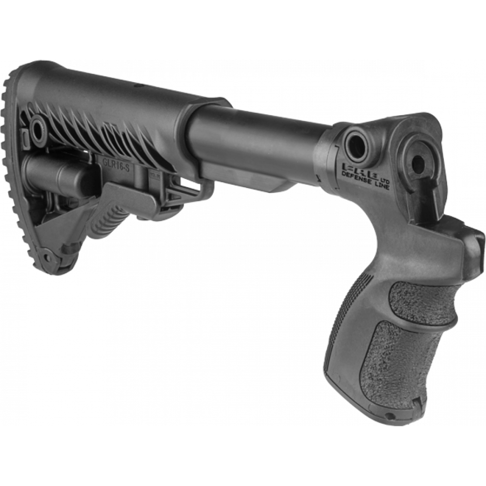 Телескопический приклад FAB LTD с тактической рукояткой на Mossberg 500. Отличается общей прочностью конструкции и удобством использования. Легко крепится вручную. Добавляет устойчивости позиции при стрельбе и точности попаданиям по цели. Форма рукоятки слегка наклонена для снижения отдачи.